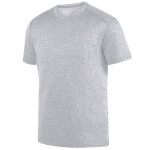 100% polyester heathered wicking knit * Cationic dye used to create heathered look and reduces chance of dye migration * Wicks moisture away from the body * Pad print label * Self-fabric modified mitered crew neck collar * Set-in sleeves * Double-needle hemmed bottom and sleeve