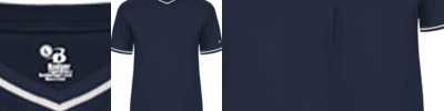 - Two color jersey side inserts, sleeve cuffs and V-neck