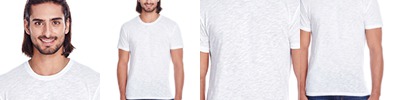 4.1 oz.; 50% polyester, 38% combed ringspun cotton, 12% rayon; 7.8 oz./lin. yd., 50% polyester, 38% combed ringspun cotton, 12% rayon; Frosted vintage heather triblend yarn; Smooth surface ideal for screen printing; 32 singles; Retail fit; Tear away label;