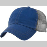 Garment washed; Cotton twill front panels and visor with nylon mesh back panels; Contrast colored crown seam taping; Relaxed, contoured crown shape; Heavy double decorative crown and visor stitching; Pre-curved PE visor.