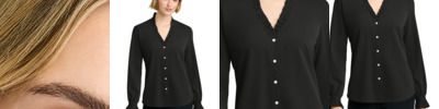Complete with ruffle accents, this classic, feminine blouse is crafted in beautiful satin. 4.1-ounce, 100% polyester satin Anti-static finish Ruffled open collar with collar stand French front placket Pearlized buttons Darts at back Single-button ruffled cuffs Rounded shirt tail hem