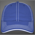 Heavyweight chino twill with garment washing; relaxed contoured crown shape with contrasting stitching and sandwich visor.
